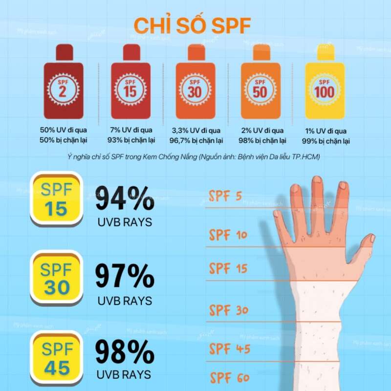 SPF (Sun Protection Factor) cho biết khả năng chống tia UVB – nguyên nhân gây cháy nắng. Chẳng hạn, SPF 30 có thể ngăn chặn đến khoảng 97% tia UVB, trong khi SPF 50 có thể ngăn chặn đến khoảng 98%.